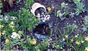 We have a small bucket/pond filled, with water iris and an oxygenating plant, which provides water for birds and a neighbour's cat! |